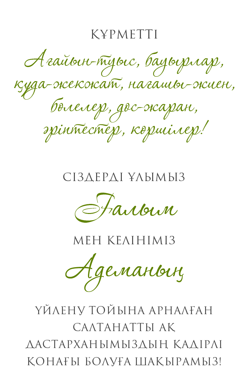 (жұбайыңызбен келетін болсаңыз, екеуіңіздің де есімдеріңізді жазуыңызды сұраймыз)